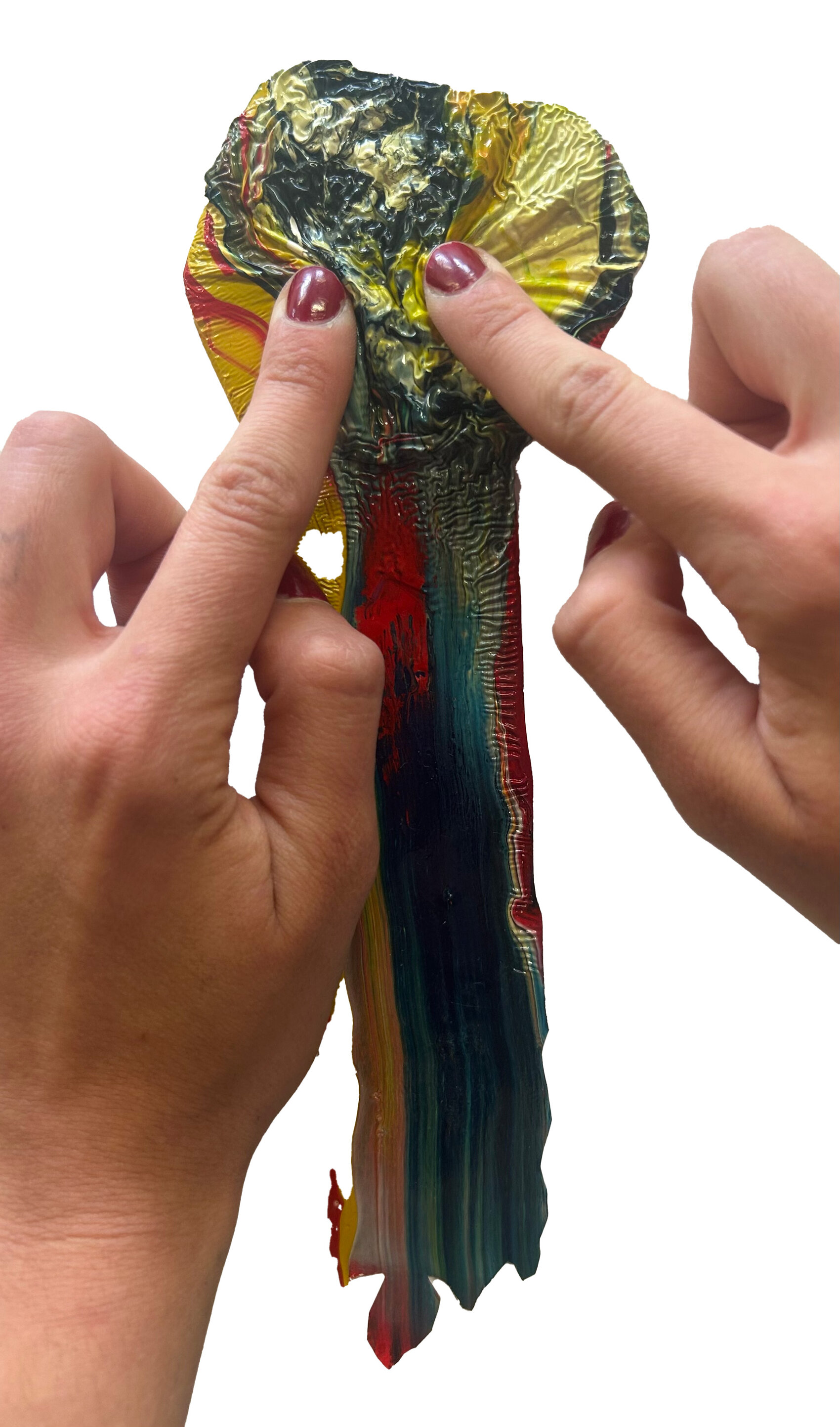 Na het schilderen van mijn schilderijen, gemaakt van lino-inkt op doek/papier. Schraap ik mijn linoverf samen op mijn grootste paletmes. Deze veeg ik uit op een papier en laat ik drogen. Na een paar maanden kan je de verfstreep aanraken, maar dit zal nog beweegbaar zijn. De bovenstela is droog en de inkt heeft zijn eigen patroon gevolgd. het is verleidelijk om het aan te raken, maar het lijkt nat en is kunst wel iets om aan te raken? Het is een tweestrijd binnenin als je dit werk ziet.