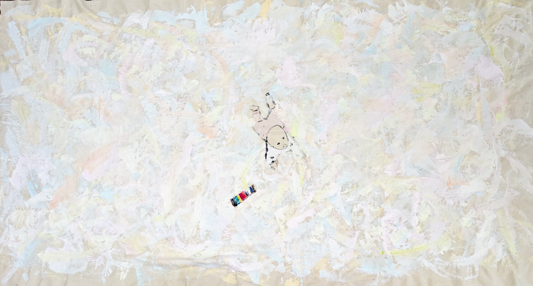 Tussen die tedere chaos ligt een kleine, kleurrijke xylofoon: een symbool van nieuwsgierigheid, van het spel en de schoonheid die het leven aanbiedt. Het vormt een stille uitnodiging tot verwondering: de schoonheid en het spel van het bestaan.