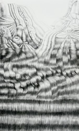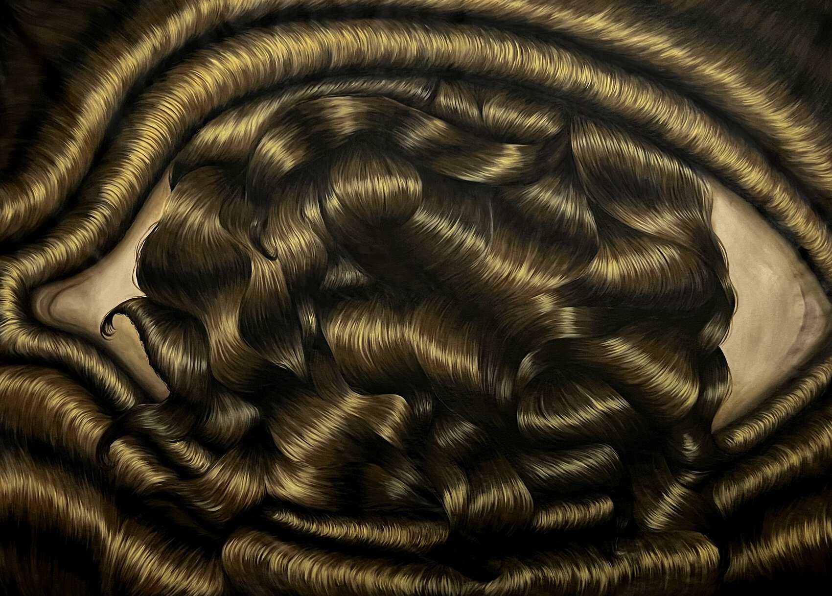 In this painting, I pay homage to René Magritte’s iconic use of the eye as a site of mystery, illusion, and introspection. But instead of presenting the eye as a window to the sky, as Magritte once did, I veil it in a dense, undulating mass of hair to transform sight into concealment. It suggests protection, trauma, memory, and censorship all at once. A seeing organ that is almost blind, a symbol of truth that is submerged in layers of cultural and emotional history. I Bring such questions : what lies behind vision itself. What is truth when the act of seeing is interrupted? What kind of knowing is possible through veils, shadows, and silence?