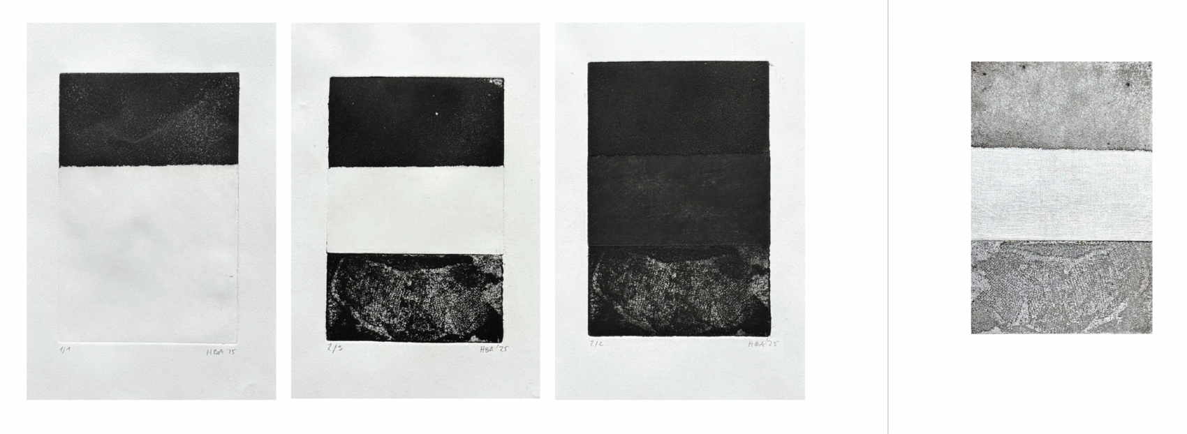 Het proces omvatte experimenten met textuur, diepte en techniek — waaronder aquatint, mezzotint en vernis-ets — om te onderzoeken hoe oppervlaktebehandelingen de visuele dichtheid beïnvloeden.