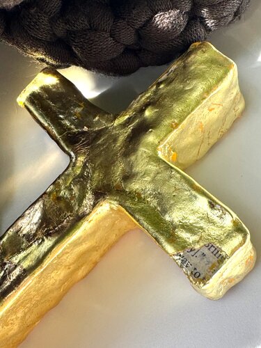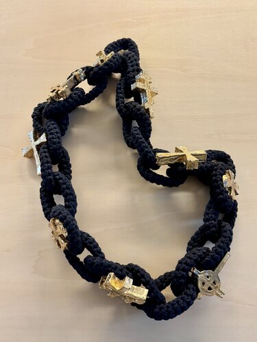 Een grote, gehaakte ketting met kruisen van balsahout, bedekt met gips en klatergoud, hangt zwaar om de hals. Het goud is aangebracht om visueel gewicht en zwaarte te geven, terwijl het materiaal zelf licht is. Dit spel tussen zwaar en licht verbeeldt hoe religie kan aanvoelen: als een juk dat drukt, maar ook als een bron van hoop. In deze spanning klinkt de vraag mee: wordt het praktiserend religieus zijn gevoed door angst, of juist door verlangen naar licht? De ketting draagt het antwoord niet, maar herhaalt zachtjes: Kom tot mij, fluistert de angst.