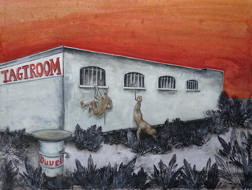 De tekening is getekend op papie en geschilderd met acryl verf en Chinese inkt. Het werk is ingekaderd met een passe partout en grijze kader die zeer goed past bij de kleuren van de schilderij. Het werk is geperst op zuurvrij karton.