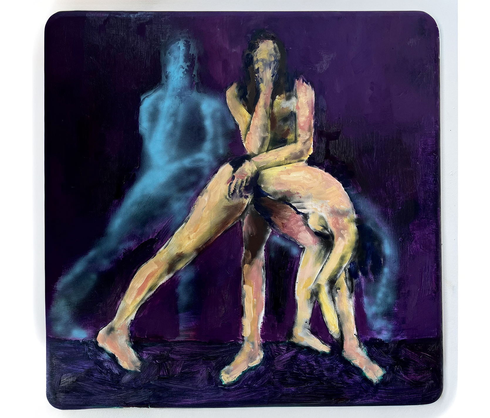 This work is painted from model reference, poses that I came up with inspired by a dance performance I've seen in Brussels. Where two dancers were moving around the stage tangled within eachother, like one creature, not individuals. This long and strange spectacle left me with feeling of uncanny, even repulsion. I wanted to convey this fascinating effect of bodies in a physcial struggle together in my work .