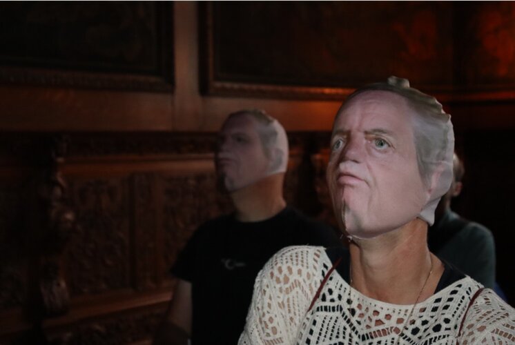 Accompanying the video, were around thirty nylon masks of the same face. One could wear it and it would stretch around their face the same way the face is stretched around mine in the video. Visitors were allowed to wear the mask all over the exhibition and have the chance to look at all the art on view trough the eyes of this Flemish minister of culture. The video and the masks are one in the question; Whats inside ? It is both a literal and figurative question from an artist to his minister of culture.