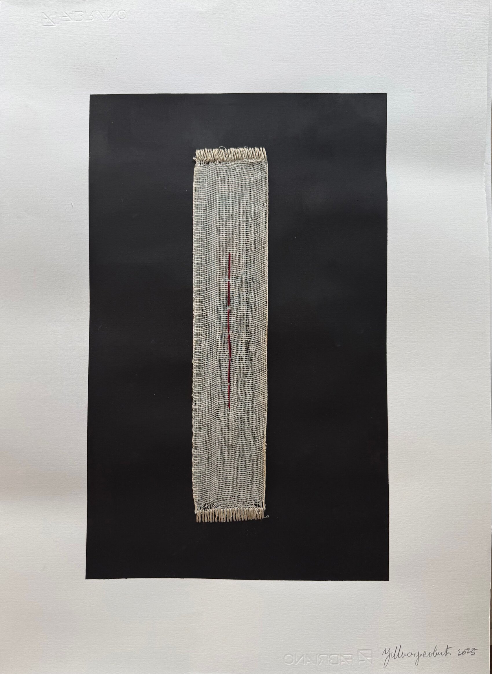 Systems of Harm and Care is a developing series of paper and textile compositions where stitching functions as both wound and remedy. Minimal grids and fields recall institutional order, while gauze, sutures, and hanging threads expose the failures and labors of care, what is obscured, repaired, or left unfinished. We register pressure, protocol, and blood; restraint and rupture. Together, the pieces hold a charged tension between control and tenderness, documenting how bodies meet systems and how repair persists despite harm.