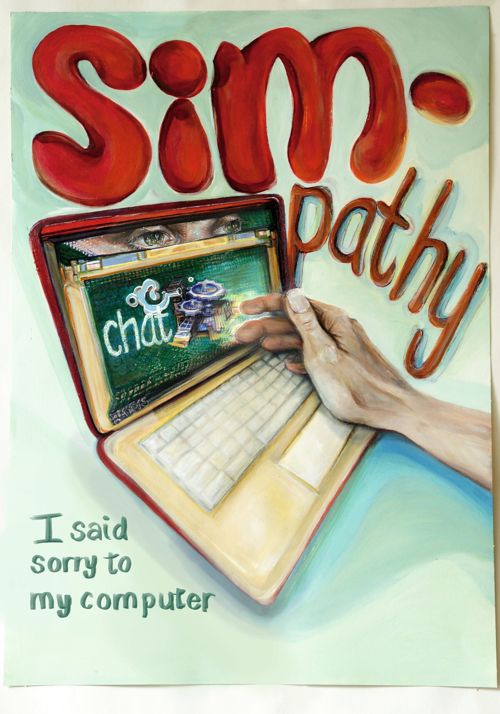 Deze poster ontstond tijdens het werken aan mijn website. Terwijl ik ChatGPT gebruikte en zelf tot inzichten kwam zonder de tips door te nemen, voelde ik even de drang om “sorry” te zeggen. Een moment van menselijkheid tegenover een machine. Uit dat besef groeide het concept SIM-pathy: een speelse reflectie op onze relatie met technologie en de emoties die we erin projecteren.