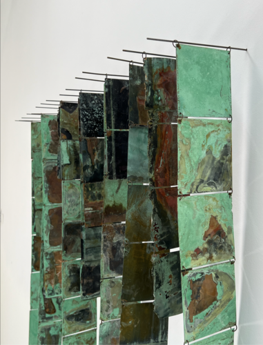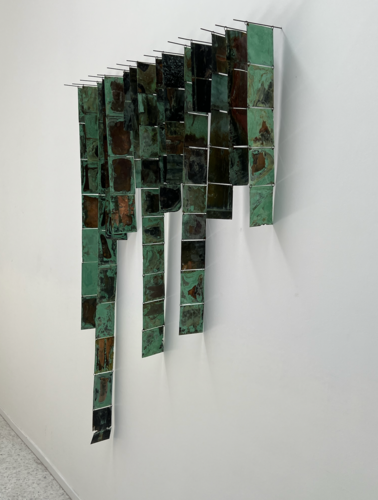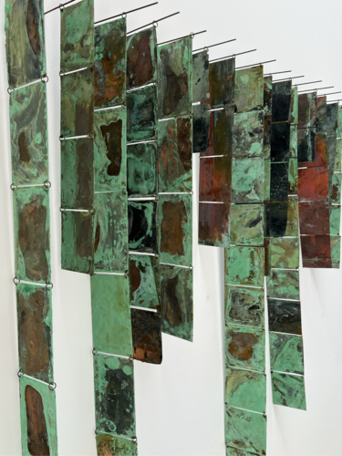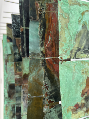 The suspended plates, each unique in their oxidation patterns, form a rhythmic structure that balances between the industrial and the organic. While the rough edges and layered surfaces allude to the passage of time and the impact of chemical reactions, the individual plates retain their own character as silent witnesses to a collaborative process between human and material.