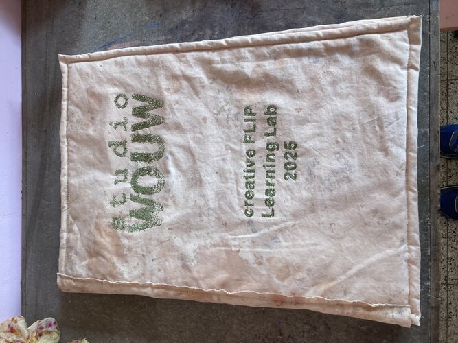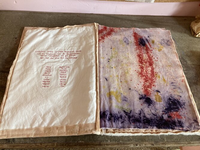 Studio WOUW organiseerde een workshopreeks rond duurzame mode, waarbij de kinderen onder andere plantaardig leerde verven. Een deel van hun creaties heb ik verwerkt tot een groot stoffenboek.