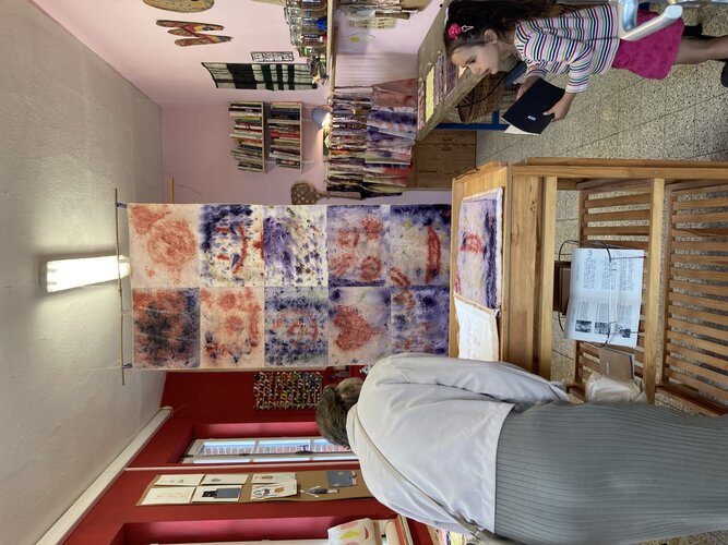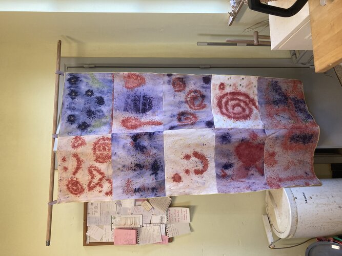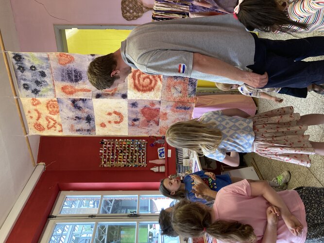 Studio WOUW organiseerde een workshopreeks rond duurzame mode, waarbij de kinderen onder andere plantaardig leerde verven. Een deel van de creaties heb ik verwerkt tot een textiele vlag. Deze hebben de kinderen mogen schenken aan hun school.