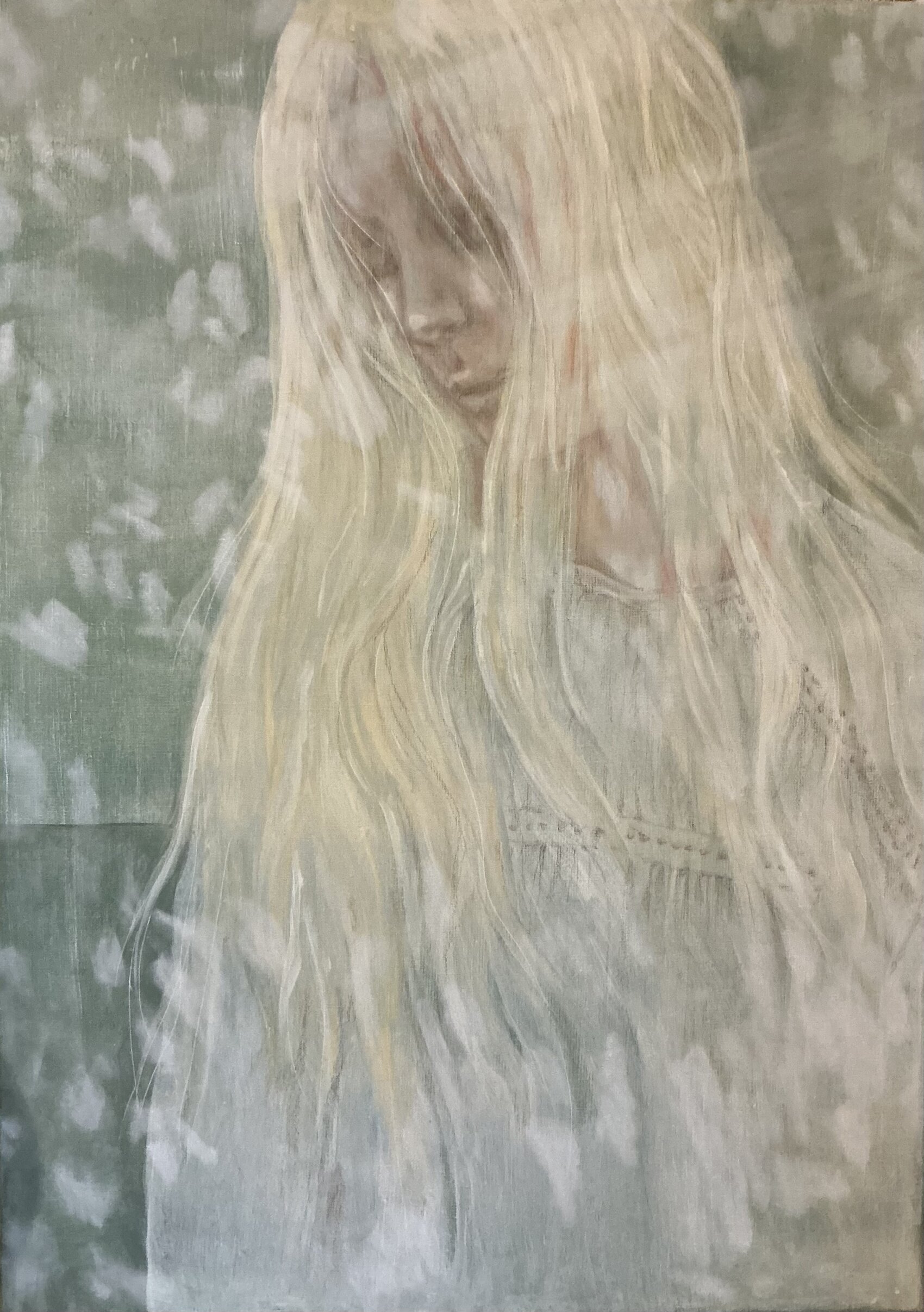 Onderdeel van de reeks ‘Les filles de ma vie’ Een reeks schilderijen die behoren tot het geheel ‘The healing’. Een project van schilderijen en grafisch werk met als thema de vrouwelijke energie in contact met de natuur.