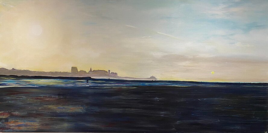 “Zeebrugge 2” vangt de essentie van een zomeravond aan de kust in al zijn pracht. De ondergaande zon werpt een warme gloed over de zee, die de contouren van Blankenberge in de verte omhult. Vastgelegd in de lagen van tijd die zich vermengen.