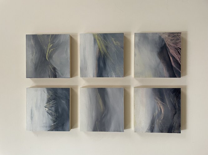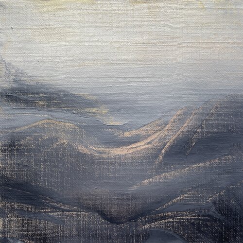Ik maakte deze serie van zes kleine schilderijtjes naar aanleiding van het verdwijnen van een gletsjer ten gevolge van de klimaatopwarming. Gletsjers verliezen in een alarmerend tempo hun massa. Ze zijn de meest gevoelige en doeltreffende vroegtijdige waarschuwingssystemen van onze planeet voor de voortschrijdende klimaatverandering — en deze systemen slaan nu alarm. Ik gaf de reeks de titel Landschapsverdriet. Een woord dat ik hoorde tijdens het beluisteren van een podcast van de Klimaatdichters. Het verlies, de aantasting, de vervreemding van een landschap dat ooit vertrouwd en levendig was. Rouw voor de natuur, voor de stilte die verdween, voor vormen die niet terugkomen. De werken zijn een visuele mijmering over verlies en vervreemding. Ze geven uitdrukking aan het verdriet om een landschap dat ooit vertrouwd en levendig was, maar dat door de stijgende temperaturen onherroepelijk wordt aangetast. Elk schilderij is een stil monument voor de natuur die verdwijnt — voor de verstilde vormen, de stilte zelf, en voor de schoonheid die niet terugkeert.
