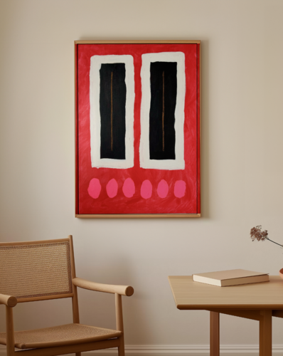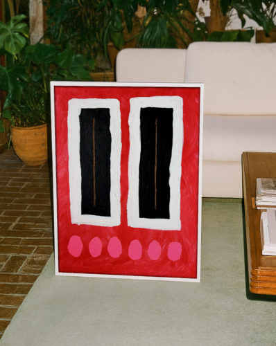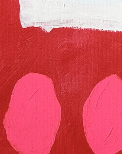 Square black eyes outlined in white, a mouth defined by six fluorescent pink circles —