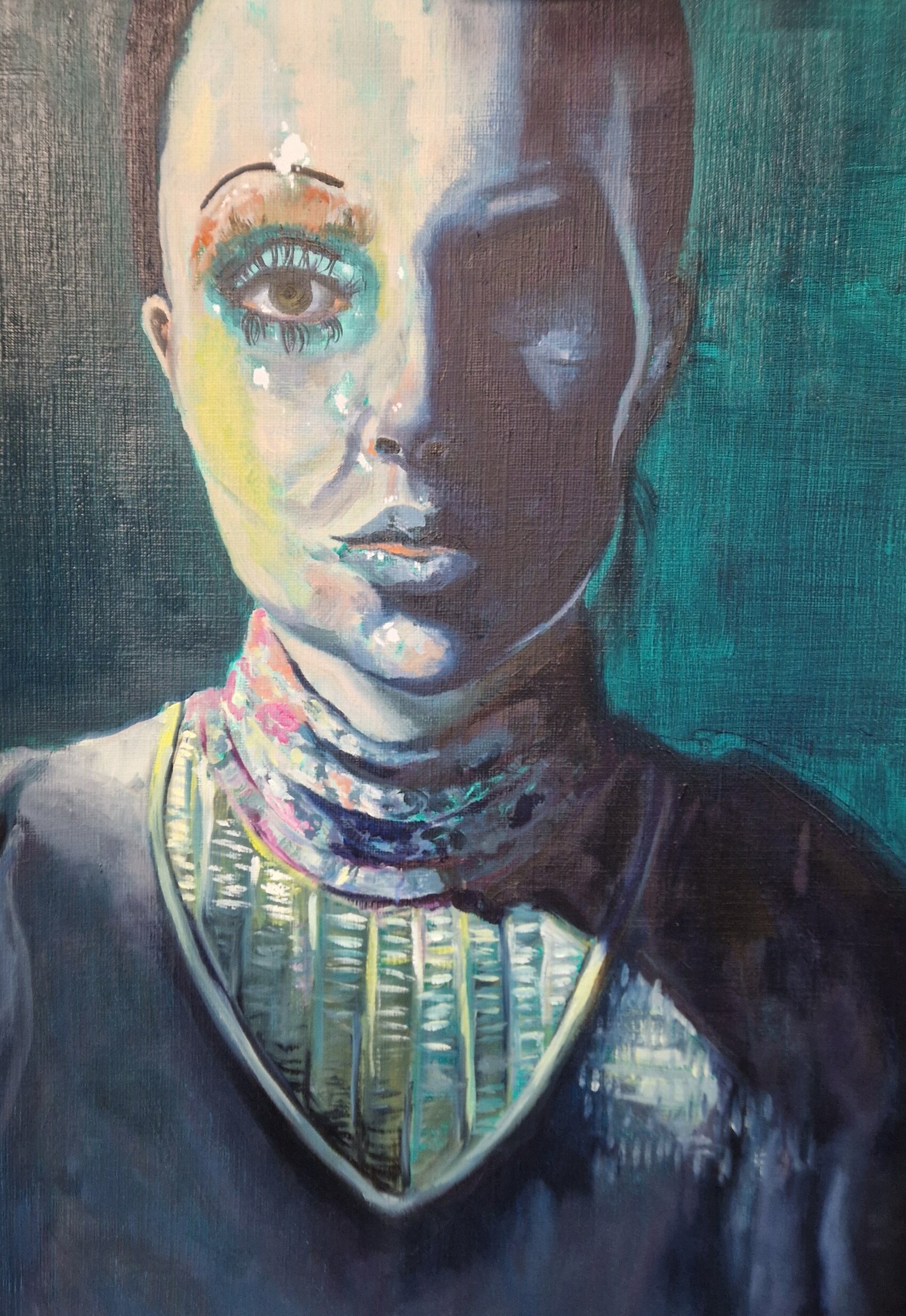 De titel van de schilderij ‘Eigentijds zelfportret’ roept meteen een vraag op. Het figuur heeft iets menselijk maar heeft tegelijk ook iets onecht. De mond is getuit, het oog lijkt dof, de wimpers gekunsteld en de dun aangetekende wenkbrauw versterken de onnatuurlijke indruk. De huid is gelaagd, gepolijst en lijkt iets transparants te hebben. Het geheel krijgt daardoor een popachtige, kunstmatige uitstraling.