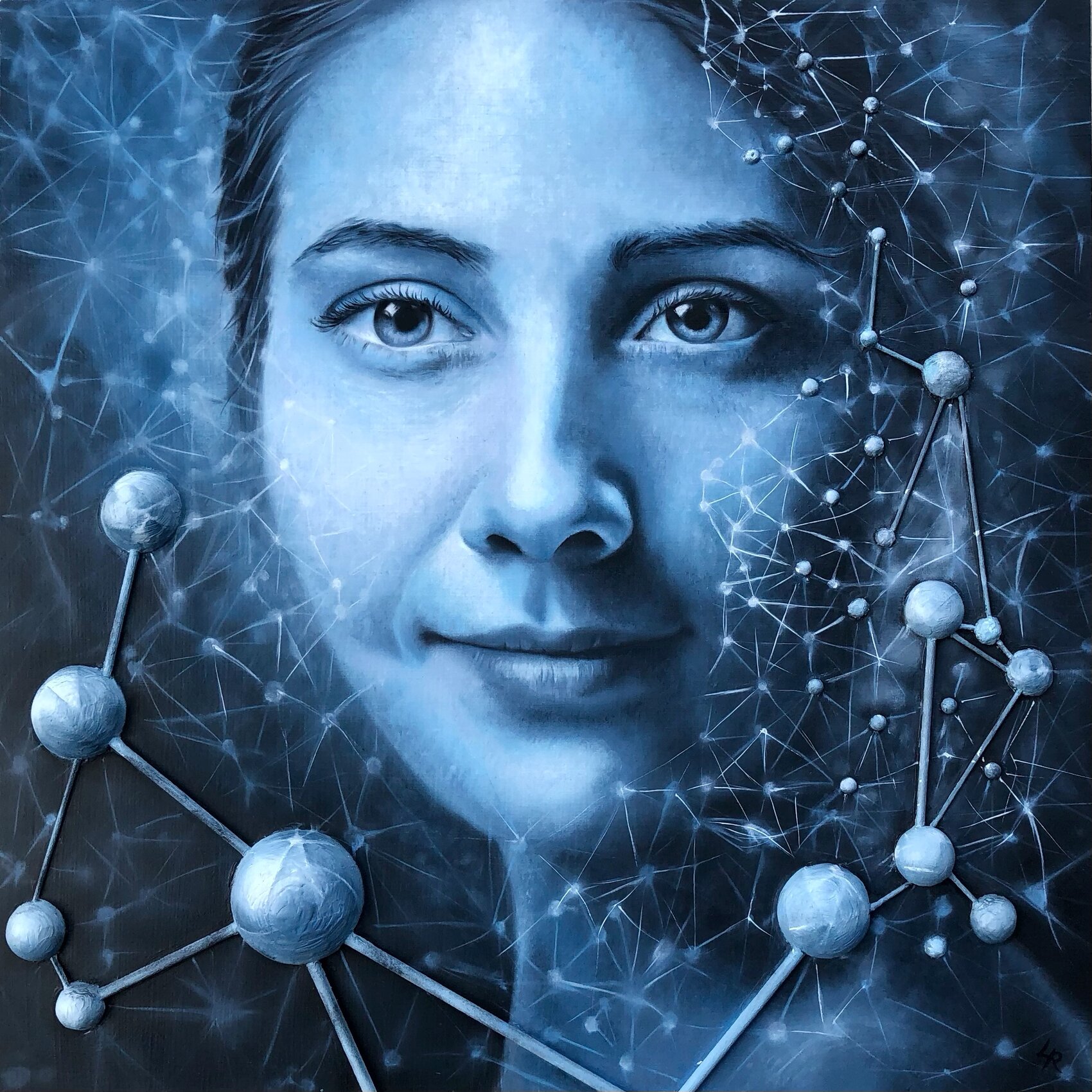 Een portret waarin wetenschap en kunst samenkomen – opgebouwd uit moleculen, verbonden met het grotere geheel.