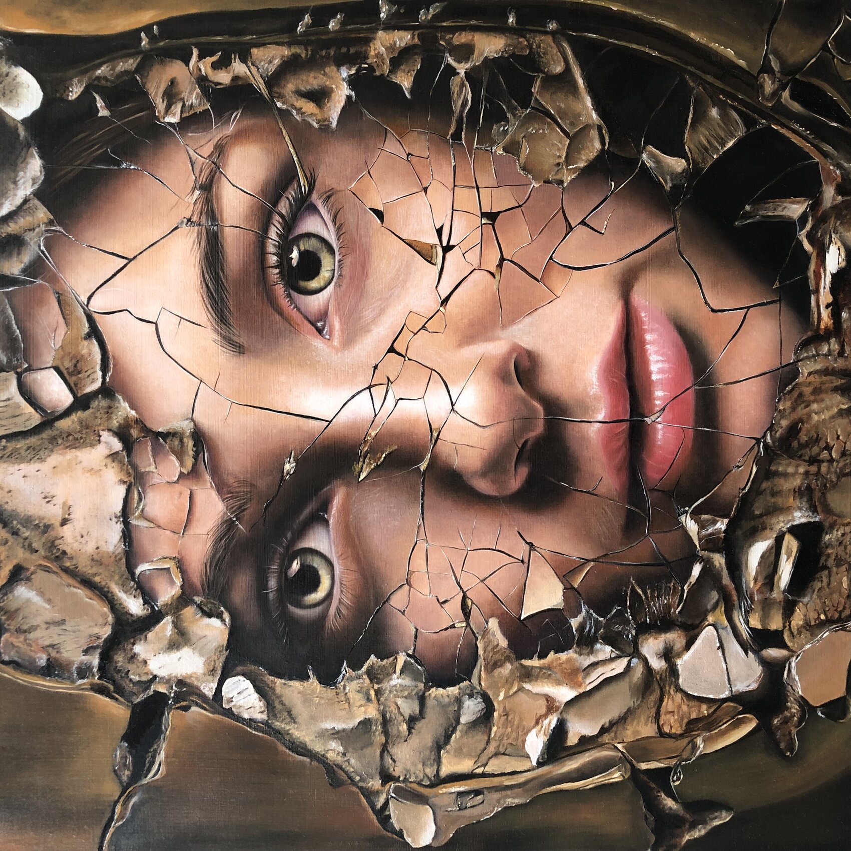 Hyperrealistisch portret van de reflectie van een jonge vrouw in een verweerde, gebroken spiegel. De barsten vervormen en versplinteren haar gezicht, waardoor haar zelfbeeld fragiel en in fragmenten verschijnt—shattered reflection.