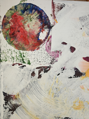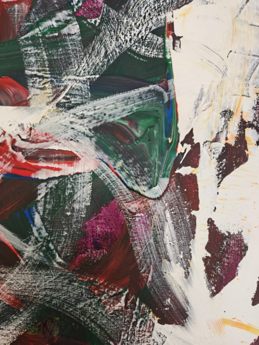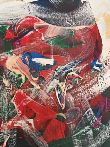 Die kleuren botsen en vermengen zich als lagen van tegenstrijdige gevoelens, een innerlijk landschap van strijd en hoop.