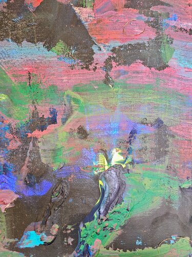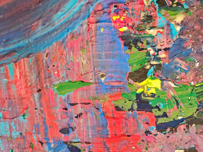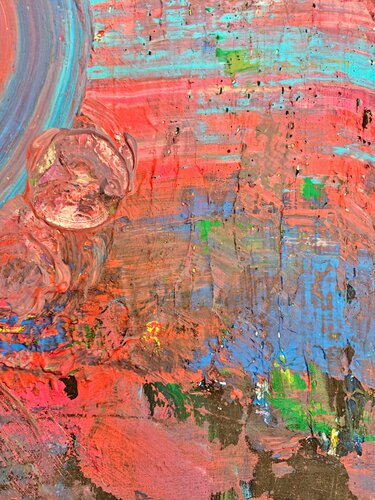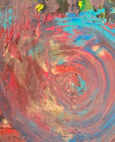 Een cirkel draait in zichzelf, een werveling van kleur en gewicht.
