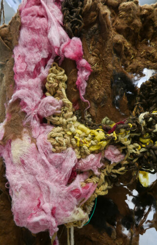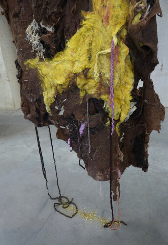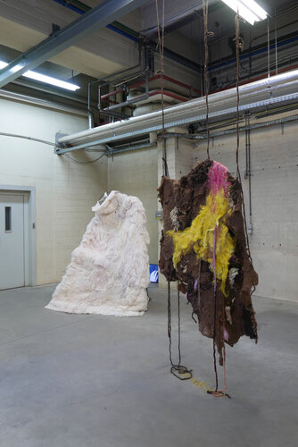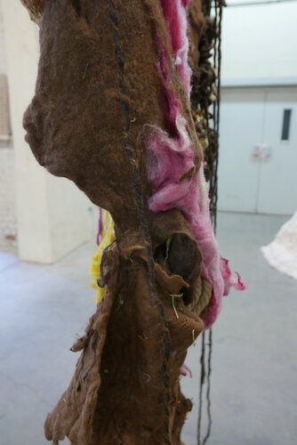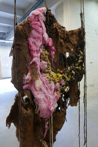 “Paincoats & Mantelzorgers” presents an ensemble of textile works, drawings and a video, that grew together organically and symbiotically. With the title, I want to reflect on vulnerability (of humans, other species, the earth) and emphasize the importance of care. This urge comes from the experience of inhabiting a body that is simultaneously caring and vulnerable. Questions can be raised about the embodied experience of pain or discomfort – what is often (expected to be) kept hidden? – and about the act of caring – who takes care of whom in the system we live in?