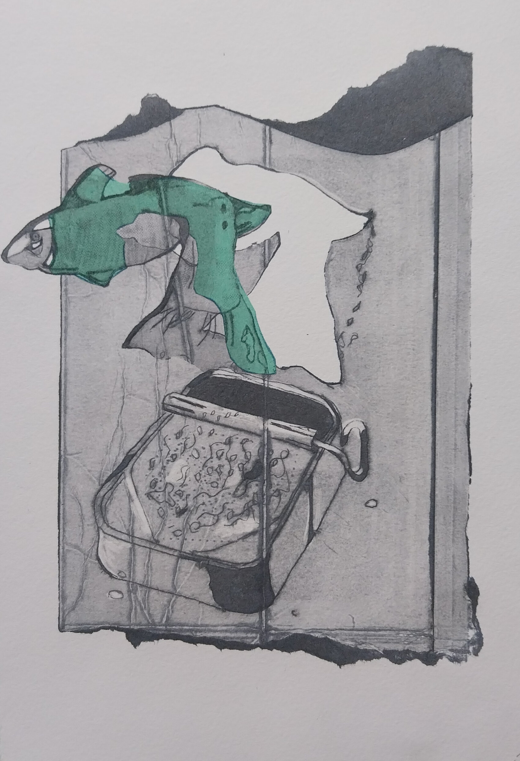 Deze kartondruk is geïnspireerd op een werk dat ik in mijn opleiding in 1983 maakte. De opdracht was: 'Maak een onverwachte situatie'.