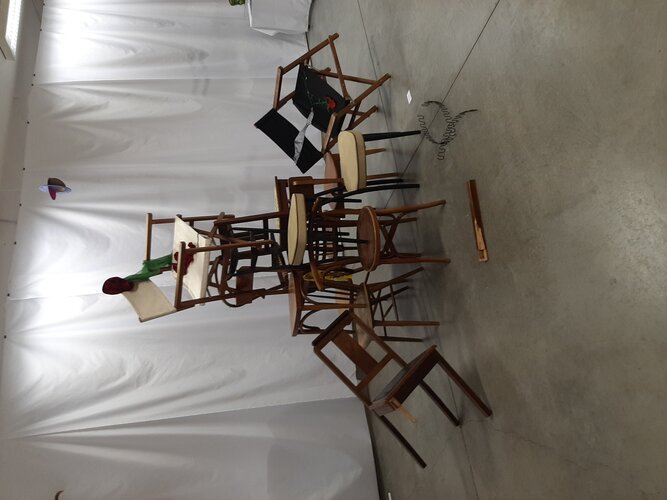We proberen grip te houden door steeds hoger te reiken en overzicht te bewaren. Maar die structuur maakt ons ook kwetsbaar, één verschuiving, een storing en heel de constructie komt in beweging. De gevallen stoel is geen einde maar een signaal. Het herinnert ons eraan dat vallen menselijk is, dat we mogen wankelen en opnieuw beginnen. Maar nodigt ons ook uit om waakzaam te zijn.