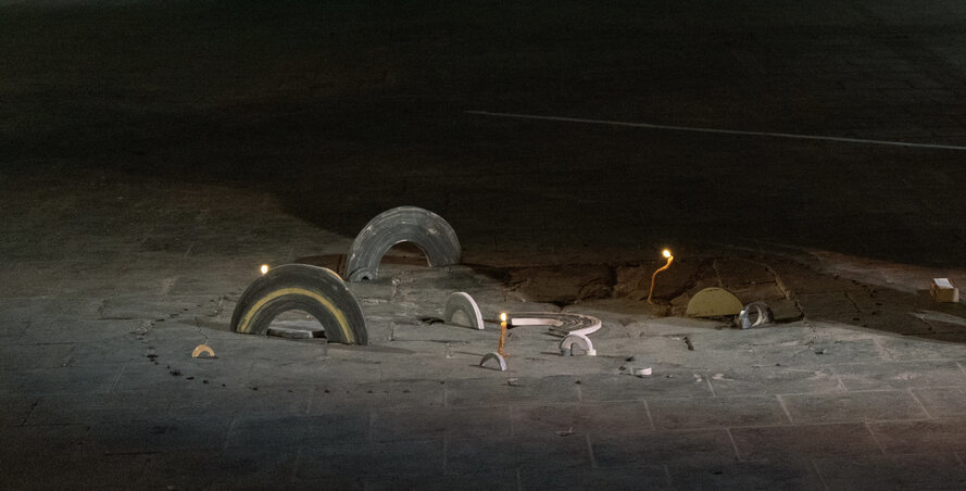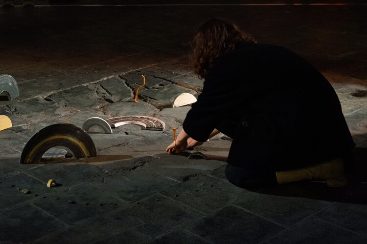 Kosmische, contemplatieve delen van een cirkel, puzzeldelen, halve manen uit een groter geheel. Kleien bogen en speelse herhalingen versteend door het vuur van de kiln, met knipoog naar de regenboog. De geboetseerde kaarsen benadrukken het efemere en branden op tot een amorfe poel was.