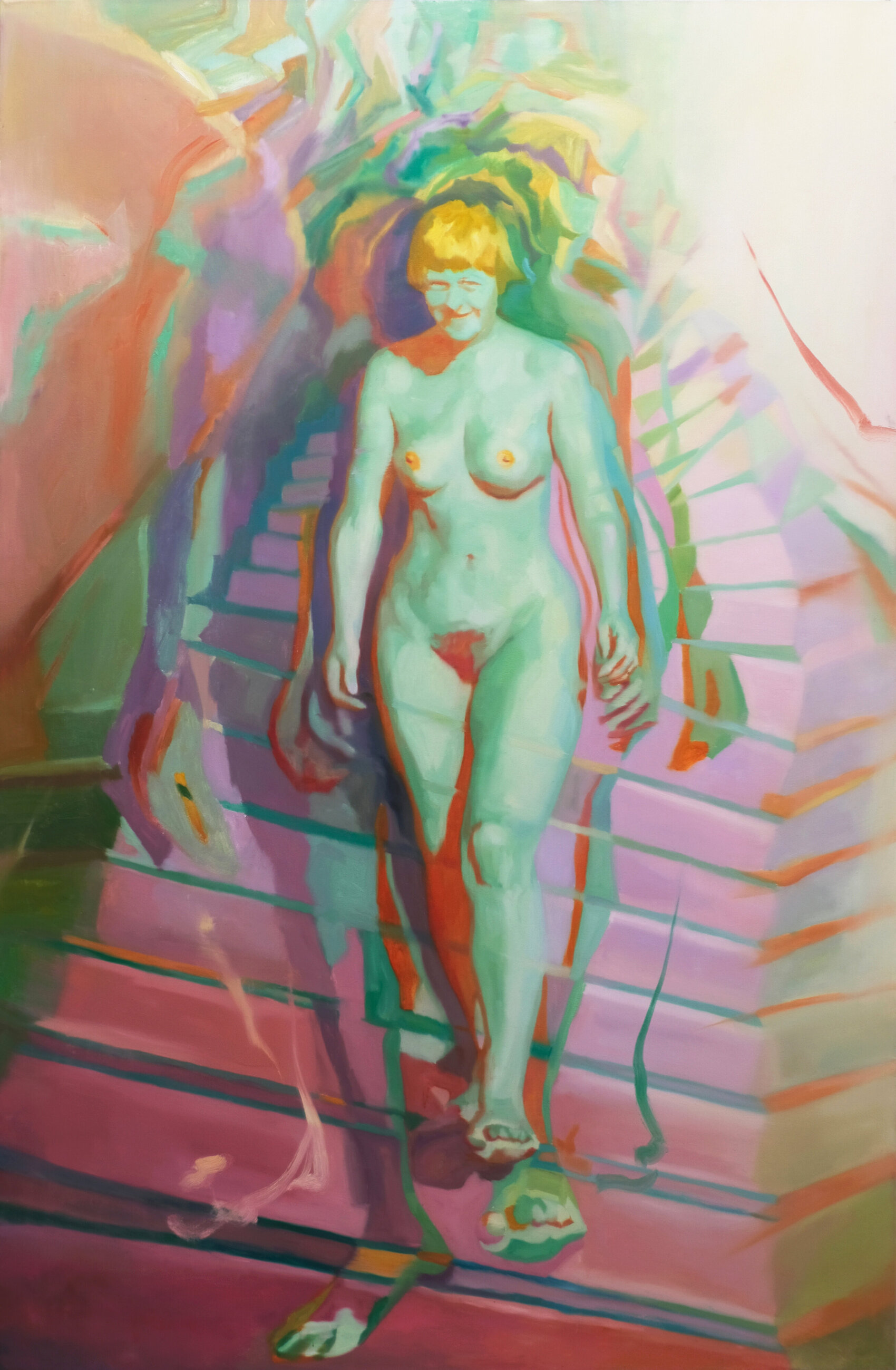 Influenced by the works of Gerhard Richter and Marcel Duchamp, the main figure in the painting is based on a photograph said to depict former German Chancellor Angela Merkel. The work creates a dreamlike and distorted atmosphere, serving as a response to contemporary society and politics.