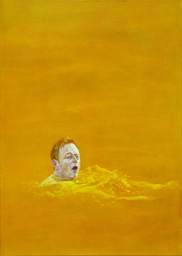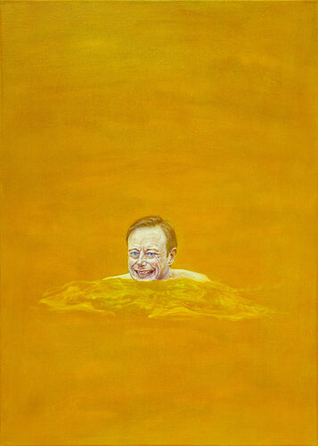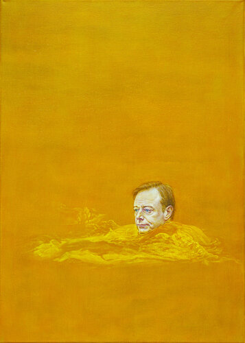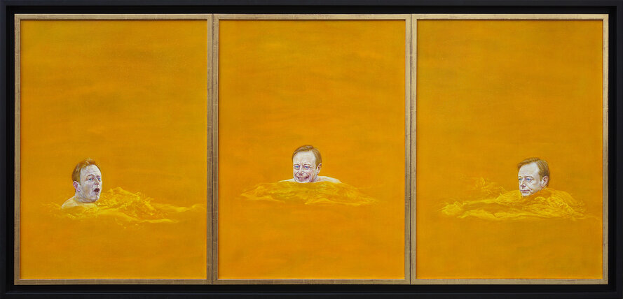 A Belgian politician depicts Bart De Wever swimming in yellow water. His head is repeated three times across the triptych, embodying the three states of this Flemish nationalist. The central panel shows a frontal face, flanked by figures looking toward the center, referencing the composition of a religious triptych. Yellow was chosen because his party, the N-VA. The black-and-gold frame also derives from the party’s colors. The work serves as a reflection on Belgian politics.