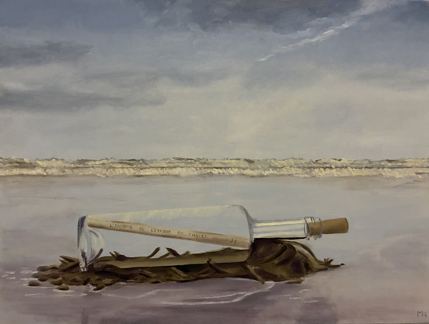 Een aangespoelde fles, met daarin een opgerold briefje. De scène verwijst naar de mysterieuze diefstal van schilderijen van James Ensor in 1978. De onbekende dader liet toen de boodschap "l'Exodus du Christ" achter. Hoewel de schilderijen later werden teruggevonden, is de dief nooit geïdentificeerd. De fles symboliseert het verborgen geheim van deze onopgeloste zaak, alsof het antwoord na al die jaren eindelijk uit de zee is opgedoken.