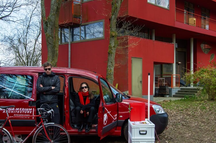 Geïnspireerd door Luc Deleu, die destijds een auto als mobiel atelier gebruikte, ontwikkelden we met M.M.A +M +E een tweede versie van zijn mobiele architectuur. Als afsluitende rit bezocht het voertuig Casa Roja [1998–2005] van T.O.P office in Tervuren – een project waarin huis en auto elkaar ontmoeten: beiden felrood, nadrukkelijk aanwezig, roepend om aandacht.