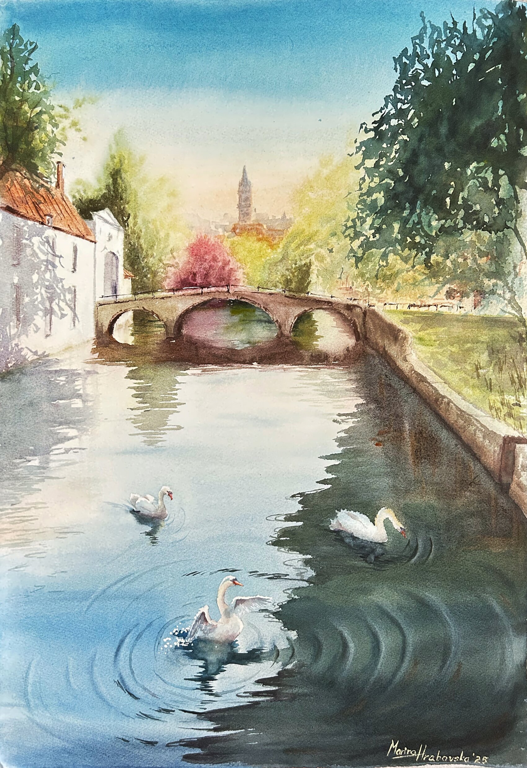 A tranquil canal scene with swans gliding across the water, inspired by the serene atmosphere of Bruges. The painting was created in pure watercolor, without the use of white paint or masking fluid, using a combination of wet-on-wet and dry techniques to achieve soft light and reflections.