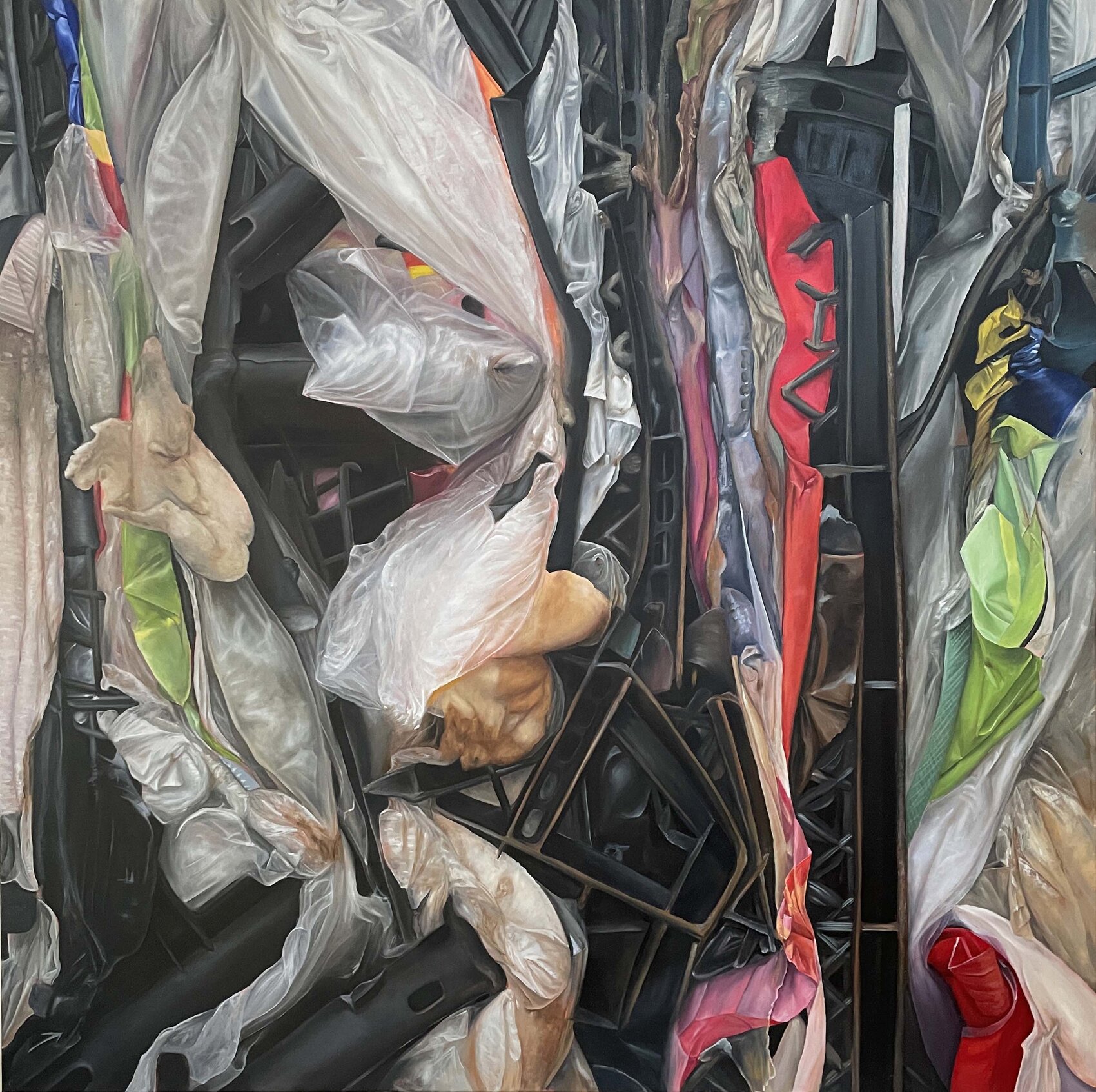Olieverf schilderij met daarop samengeperst plastic afval afgebeeld.
