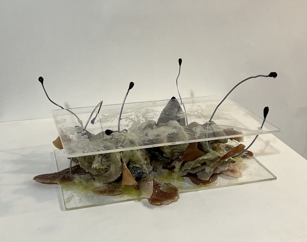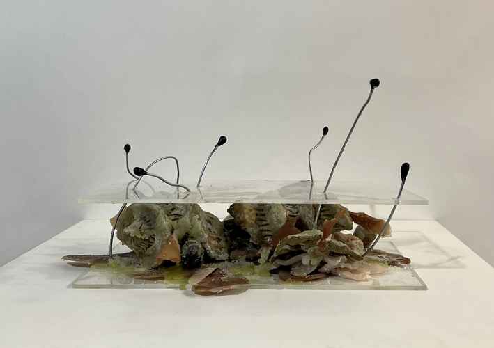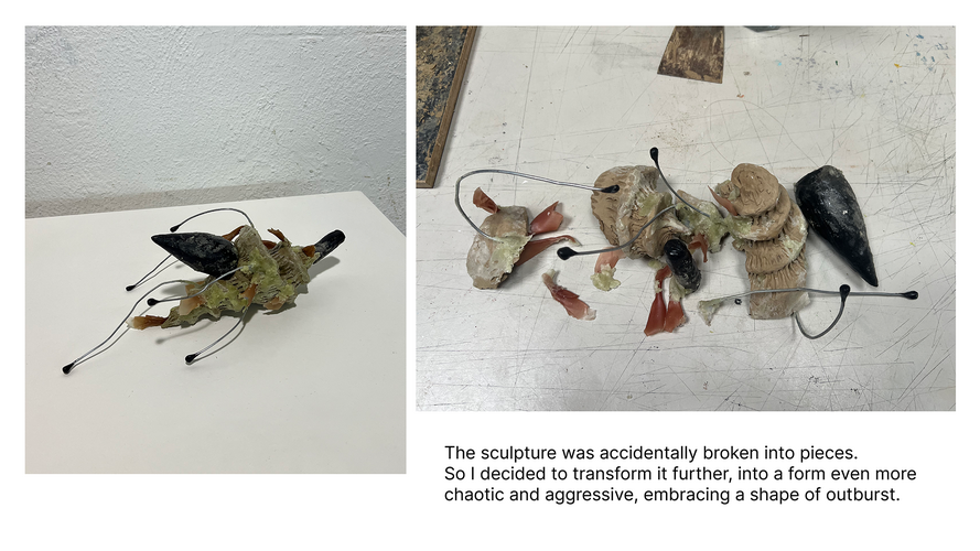 Through re-assembling fragments of a shattered clay sculpture into a chaotic order, this artwork explores the paradox of sculpture as both static and transformative. After the original piece was accidentally broken, I chose not to restore it, but instead to reconfigure its remains into a new form: one that embodies a more dramatic, unstable energy--as if the sculpture were erupting outward, a creature struggling to escape an oppressive trap.