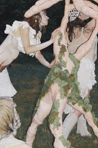 A series of almost unearthly objects forms the heart of this installation: four pink sculptures set within a verdant landscape. Combining synthetic and natural elements, the works are composed of metal structures with pigmented A1 coating over fiberglass, their surfaces layered with moss that appears to grow naturally. These living assemblages celebrate the abundance, change, and innate beauty of nature while exploring the interconnectedness of space, matter, and being.