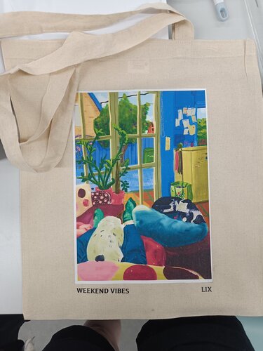 Ik vereeuwigde het werk op wat nu mijn favoriete totebag is.