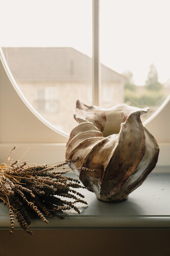 Ik speelde al een tijdje met het idee van een vaas geïnspireerd op een grote schelp (wulk). Langzaam kreeg het vorm in mijn handen. Net als de zee zelf is geen enkele schelp hetzelfde, elk stuk heeft zijn eigen vorm, structuur en kleurenschakering. Dat zie je ook terug in deze vaas.