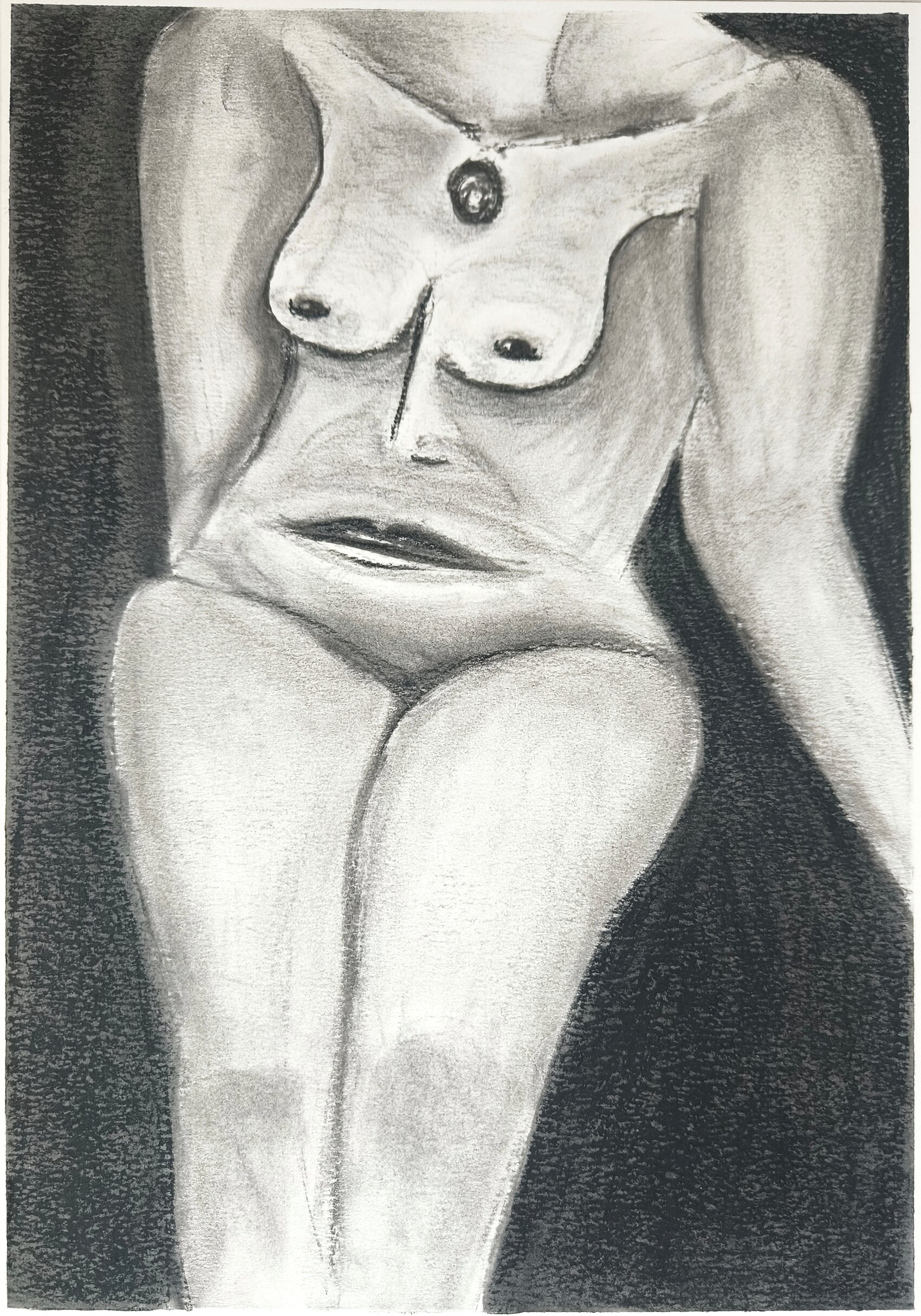 Wat begon als lijntekening met inktpenseel tijdens een les met naaktmodel, werd eerst herwerkt tot een collage en tot slot in houtskool met schaduwwerking uitgediept. Via een omweg werd zo, in houtskool op papier, 'de vrouw zonder aangezicht' geboren.