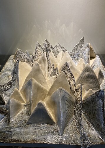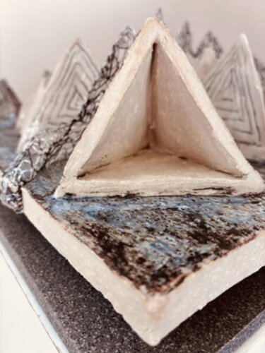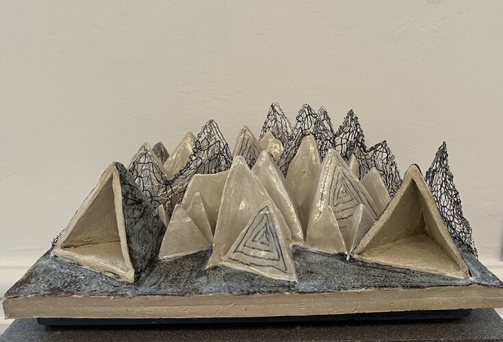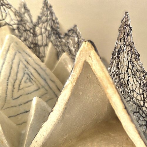 De compositie bestaat uit driehoekjes in keramiek van groot naar klein en met gesloten en open vormen. Het is een asymmetrische, geometrisch en centrale compositie geworden, die beweging heeft door de grote hoeveelheid driehoekjes. De Driehoekje beschouw ik als berglandschap waar de kant de mistsluier vormt.