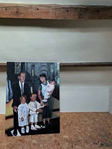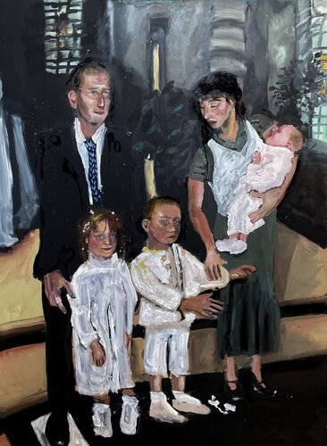 ‘Familieportret’, olieverf op hout (150x110cm), toont het gezin van de kunstenaar. Het perfecte plaatje van een gezin, geschilderd op een lugubere grauwe manier.