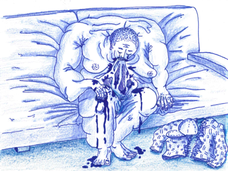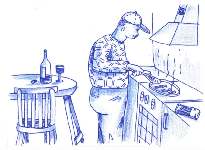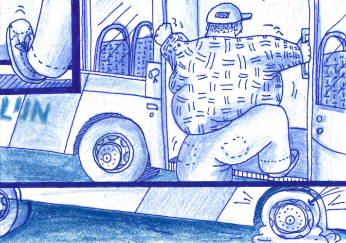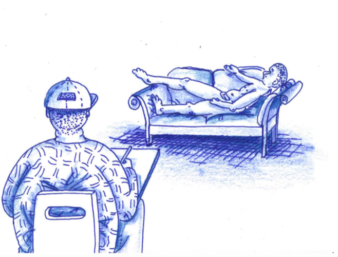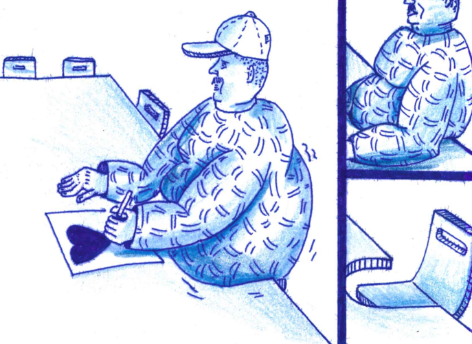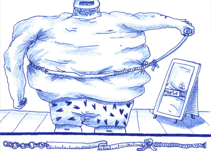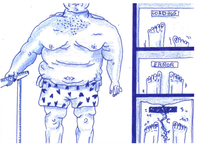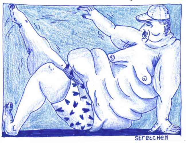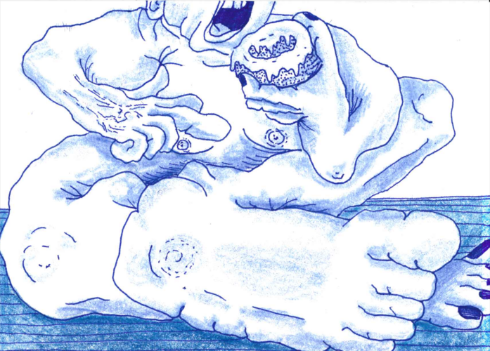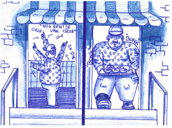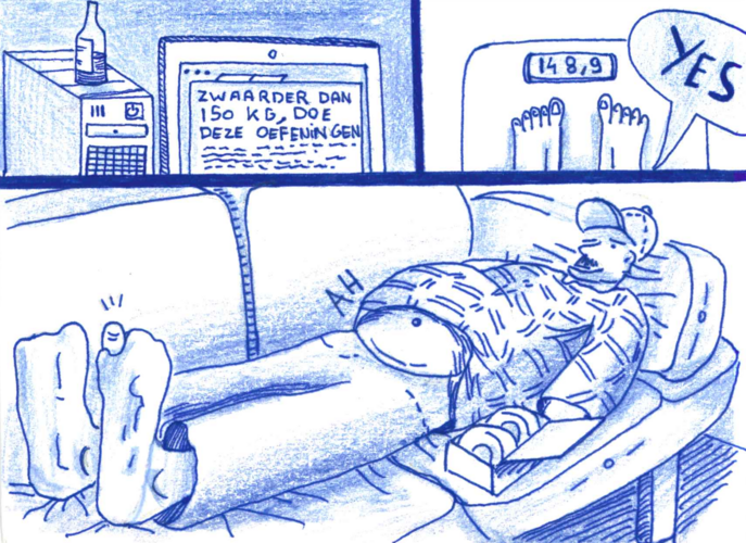 Voor dit project creëerde ik een alter ego: een versie van mezelf die steeds dikker wordt, terwijl ik mijn eetgewoonten strikt moet controleren. Dit alter ego dient als uitlaatklep voor de spanningen die ik ervaar door mijn dieet en discipline. Elke dag teken ik mijn alter ego in alledaagse situaties, zoals boodschappen doen of naar een feestje gaan. Ik koos ervoor om te werken met potlood en een blauwe pen. De nadruk ligt op het dagelijks voltooien van een tekening, wat me helpt de praktijk vol te houden en onderweg nieuwe inzichten te ontdekken. In het begin was het moeilijk om consequent te blijven, maar na verloop van tijd werd het natuurlijker en moeitelozer.