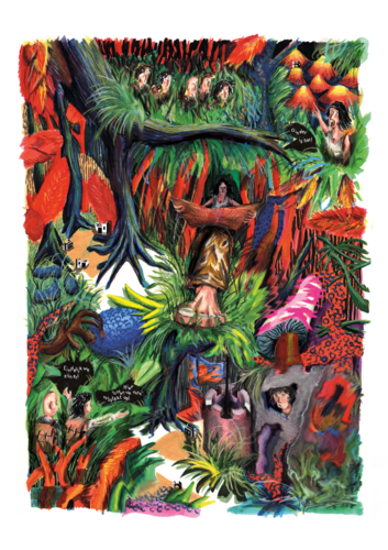 Een drieluik in de vorm van een beeldverhaal waarin een groep mensen een eigen anarchistische vrijstaat wil oprichten in een vreemd en onherkenbaar land. Het werk schetst een zoektocht naar vrijheid en gemeenschap, ingebed in een gelaagde, psychedelische wereld. Dynamische perspectieven en felle kleuren botsen en vloeien in elkaar over, waardoor een sfeer van chaos en mogelijkheden ontstaat. De combinatie van houtskool, ecoline, kleurpotlood, fluostiften en krijt versterkt de intensiteit en gelaagdheid van het beeld, en nodigt de kijker uit om stap voor stap een nieuwe werkelijkheid te ontdekken.