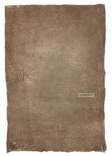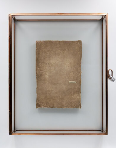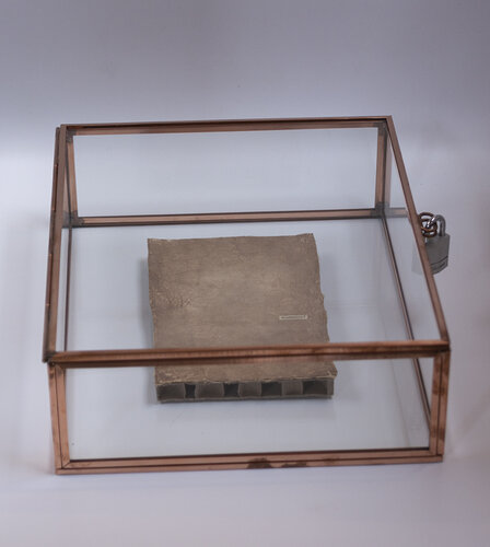 Gemengde techniek op een gebruikt theezakje gepresenteerd in een slotvaste artisanale vitrine box.
