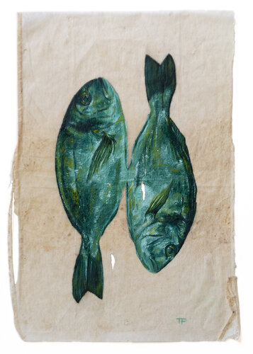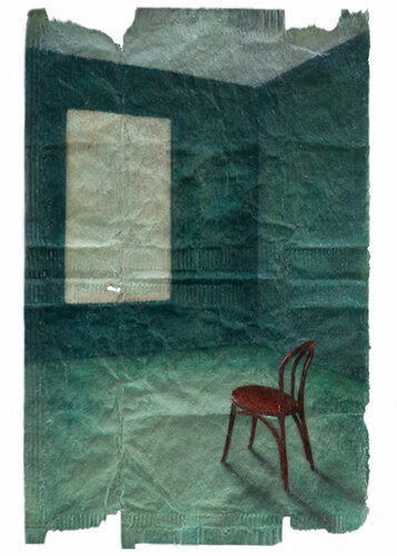 - Miniatuurschilderij in olieverf van rode stoel en rode ballon op een gebruikt theezakje, ingelijst baklijst Artglass AR70, 36,3 X 26,3 cm