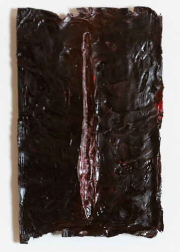 Gemengde techniek op een theezakje in een plexi box met gekleurde omlijsting.