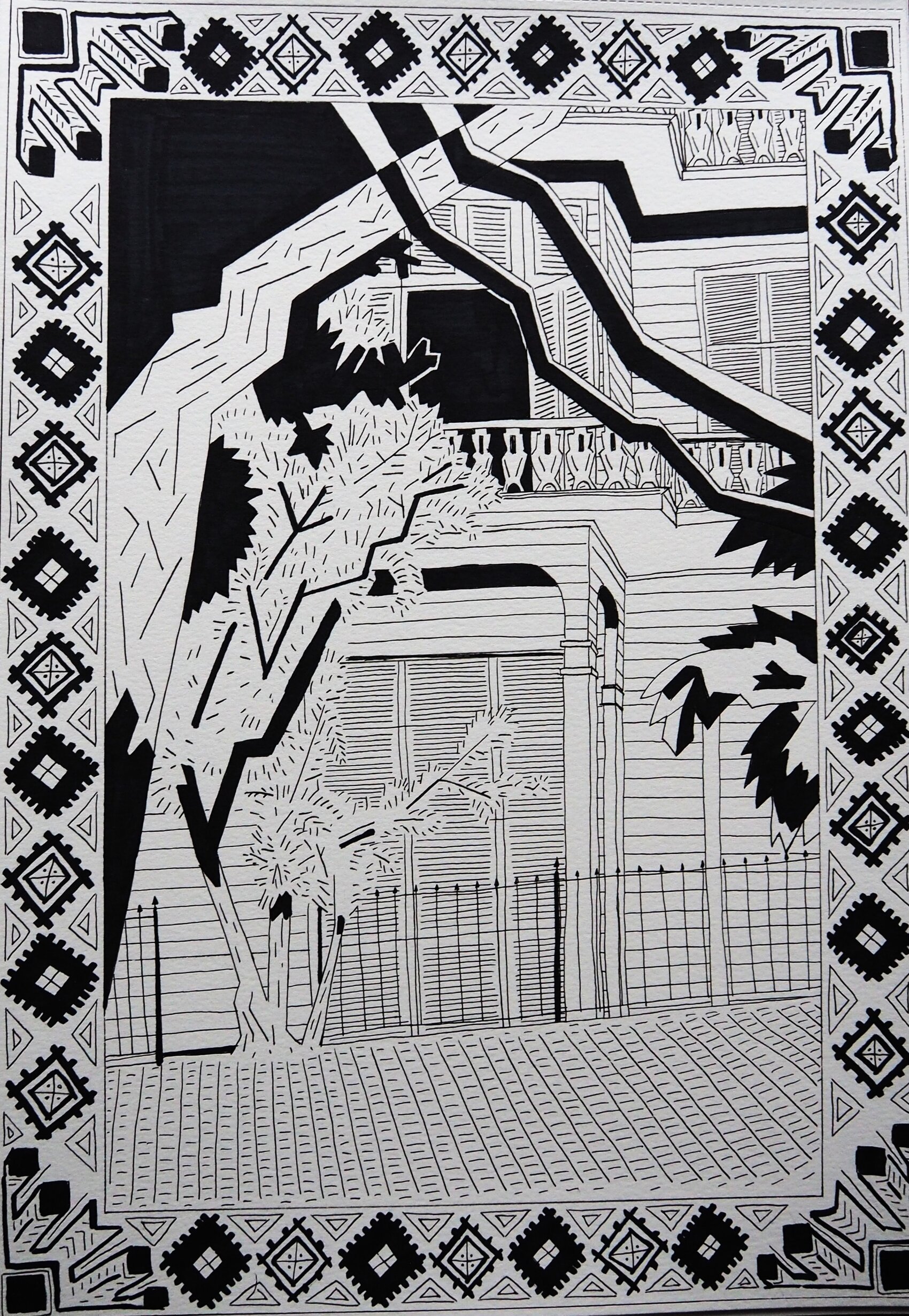 Dit beeld is een tekening van een van de authentieke houten huizen op het Turkse prinseneiland Büyükada. Rondom is een patroon met typische symboliek die ook in Turkse tapijten terug te vinden is.