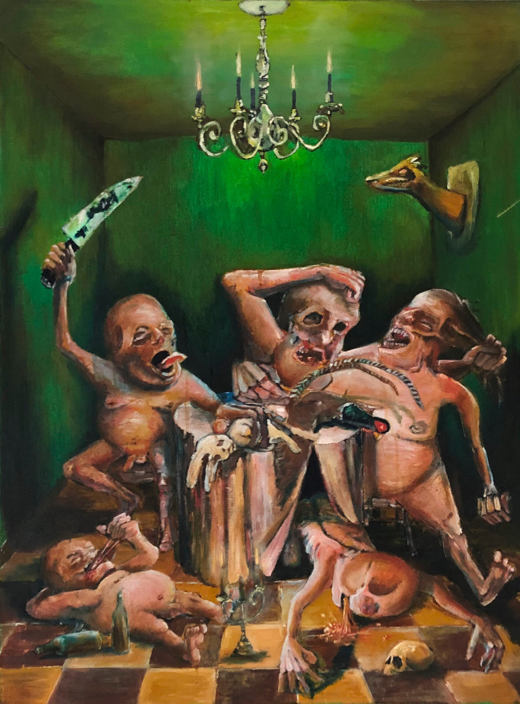 De menselijke figuren zijn eerder demonisch dan menselijk geworden. Het tafelmoment dat in vele huishoudens een gezellig gebeuren is, wordt hier weergegeven als een dispuut. Er is lust, gulzigheid, overdaad, agressie in te vinden. Een weergave van hoe de meest welvarende onder ons worden ervaren door de kleine mens.