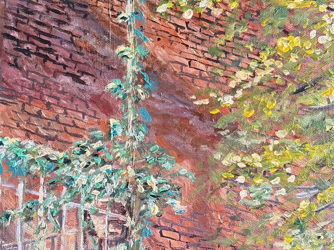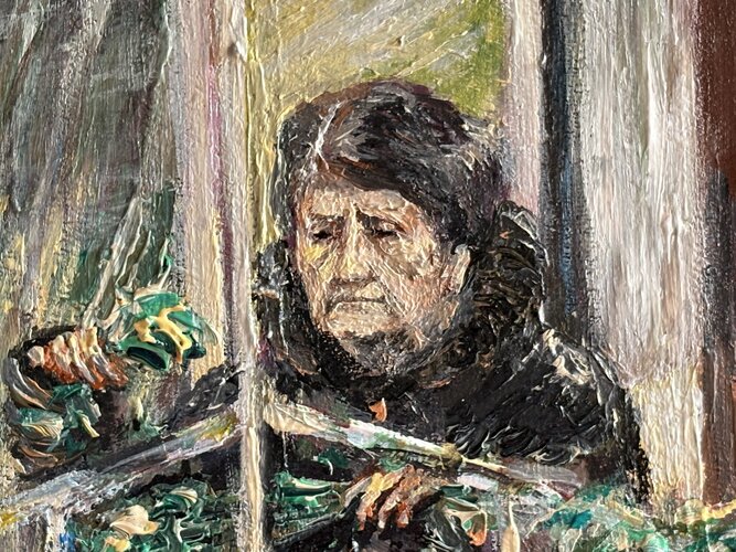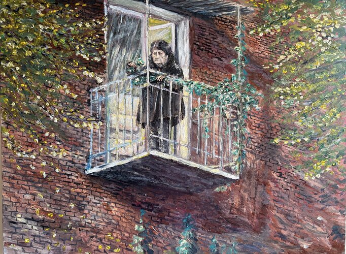 This painting portrays an elderly woman who lives alone and has stepped onto her balcony to tend her roses. It is a calm, sunny day, and the scene is defined by quiet presence rather than action.