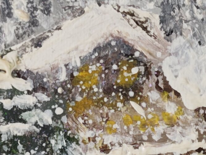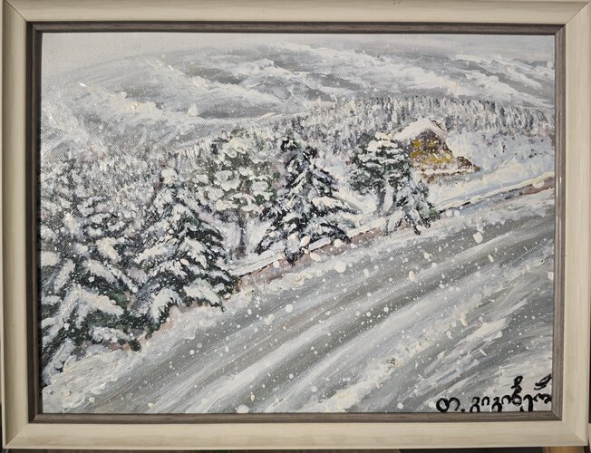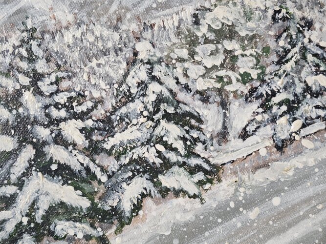A snow-covered road cuts through a dense winter landscape, leading toward a distant house barely visible through falling snow. Heavy impasto and sweeping brushstrokes convey movement, resistance, and the quiet persistence of travel in harsh conditions.