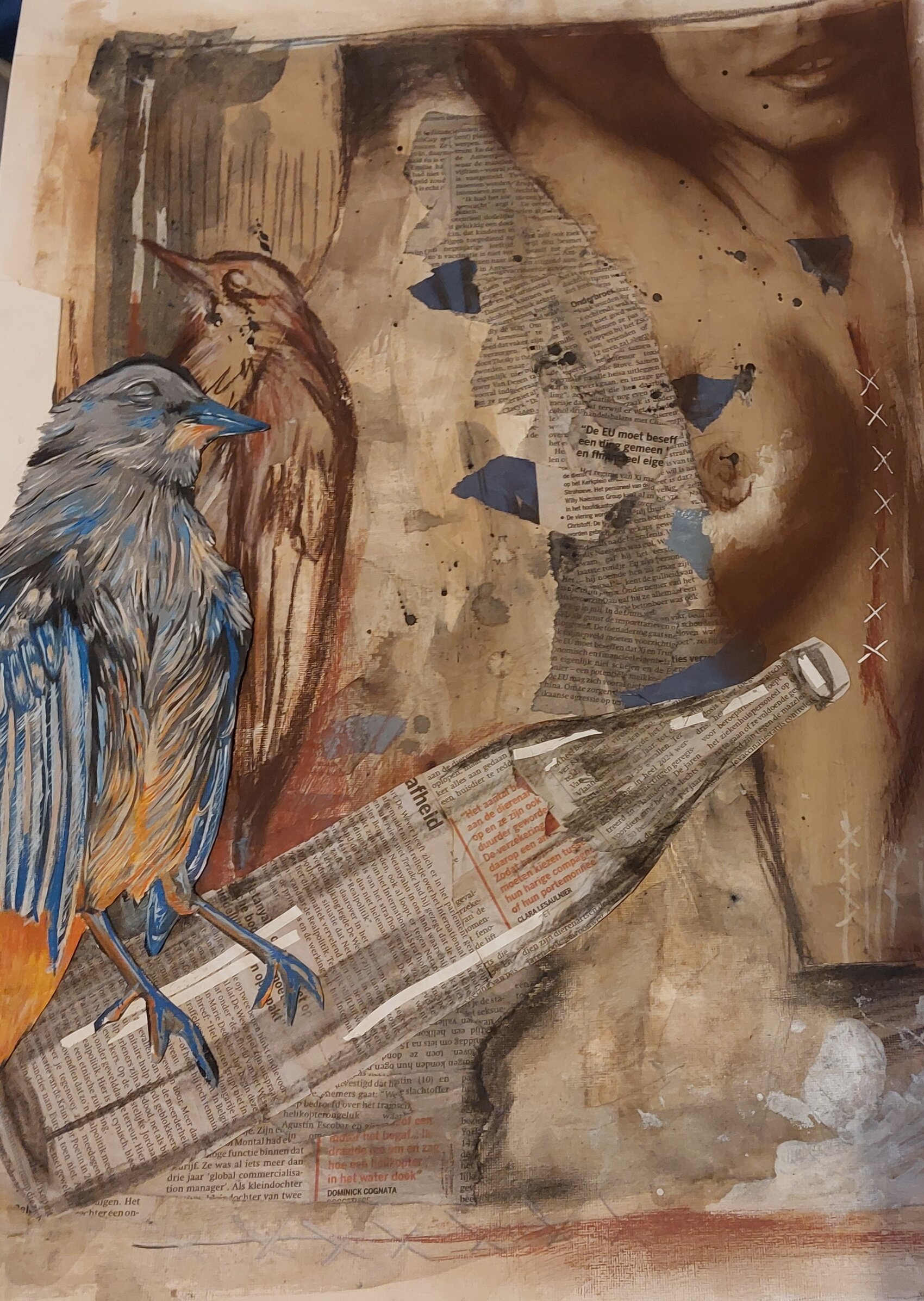 Nog een opdracht was een boekposter ontwerpen in een techniek naar keuze ! Ik koos voor het boek Vogelman van Mo Hayder. Het is mixed media geworden met een opbouw met bister, daarachter stukken kranten papier en bruin papier! en dan met houtskool en acryl elementen!