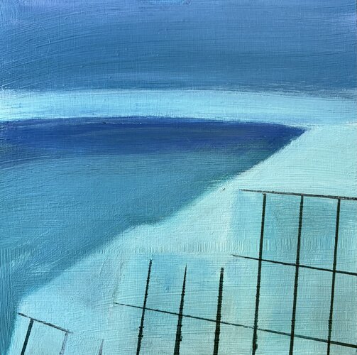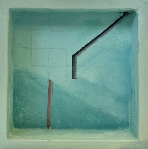afmetingen : 20x20 cm - Werk 6 : Piscine in de diepte, acrylverf op hout, afmetingen 15x15cm